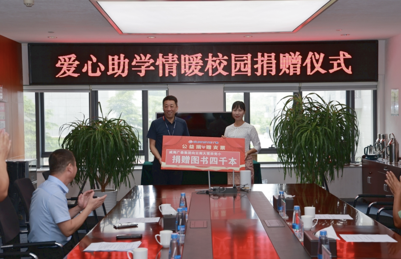 近日,云南大荒田駐村第一書記趙偉率云南大荒田完小校長李梅一行11人來訪威海廣泰,李文軒董事長一行熱情接待并在大廈三樓會議室進行了“愛心助學·情暖校園”捐贈儀式。李文軒董事長代表廣泰公司向云南大荒田完小捐贈30萬元助學基金,并代表全體廣泰員工將6月1日捐贈的4000冊愛心圖書一起轉交給李梅校長。